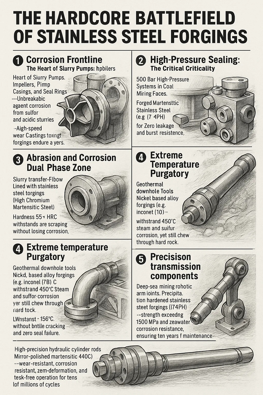 Slurry Transfer Albows: Foret med rustfritt stålgrader (High-Chromium Martensitic Steel)-Hardness 55 HRC, tåler malmskraping uten å miste korrosjon. Ore-Vashing Screen Support: Duplex stål smidde kontakter-tåler sulfidkorrosjon og malmpåvirkning, og krever ingen erstatning på ti år.