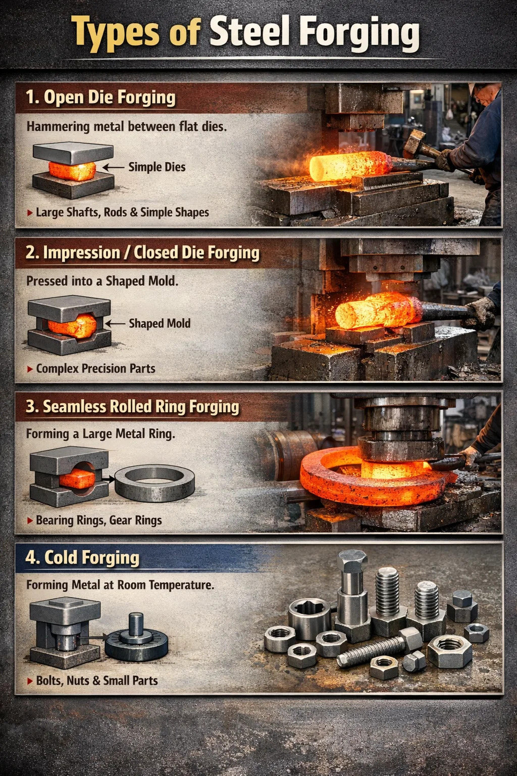 Innen metallbearbeiding er det mange forskjellige smiprosesser. I henhold til den vanligste klassifiseringsmetoden, stålsmiing kan vanligvis deles inn i følgende fire kategorier: