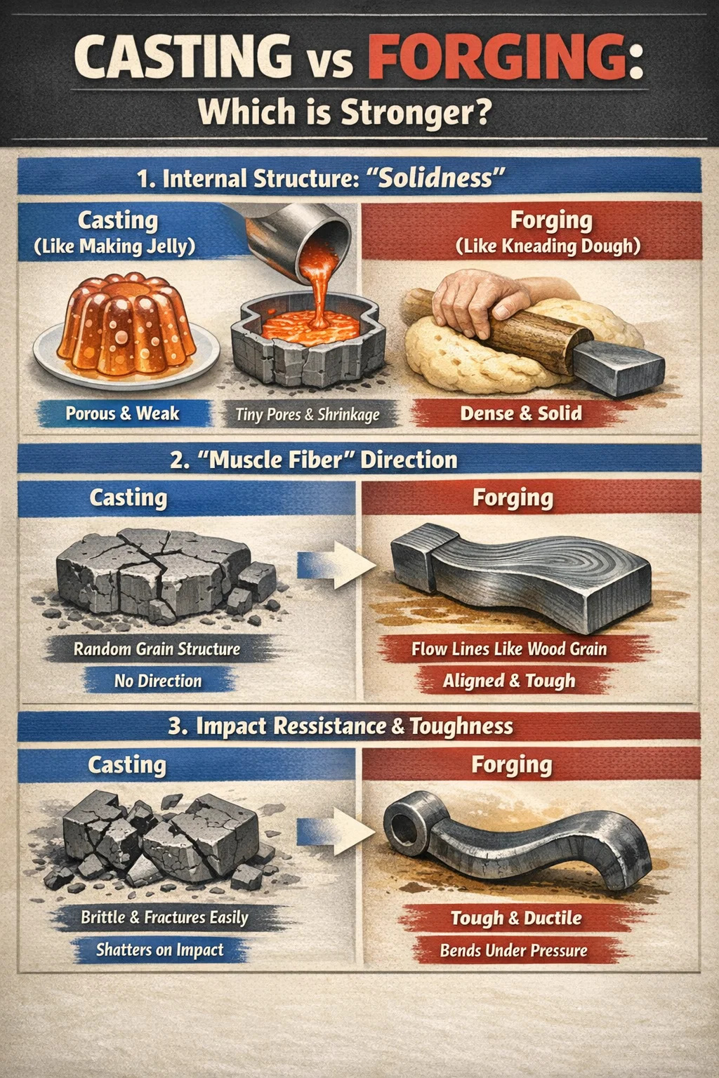 Hvis vi sammenligner metall med matingredienser, er støping som å "lage gelé", mens stålsmiing er som å "elte deig". Selv om begge kan skape ønsket form, er den indre tettheten og slagfastheten helt forskjellige.